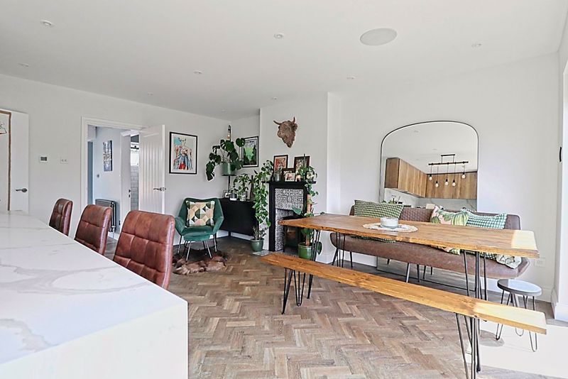 Double glazed bi folding doors to rear garden, feature fireplace, smooth ceiling incorporating downlights and speakers, Amtico flooring with underfloor heating, opens to Kitchen area.