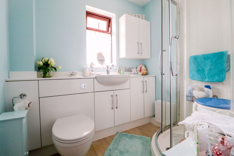 Obscure double glazed window to front aspect, double shower cubicle, raised shower system, hand basin, low level W/C, part tiled walls, radiator, wood effect flooring.