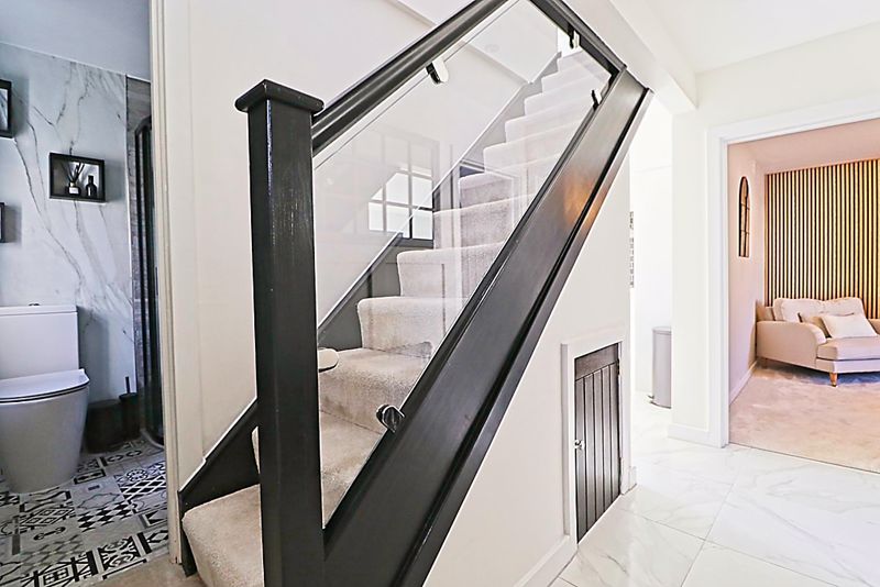 Stairs leading to first floor accommodation, under stairs storage, radiator, smooth ceiling incorporating inset down lights, tiled flooring.