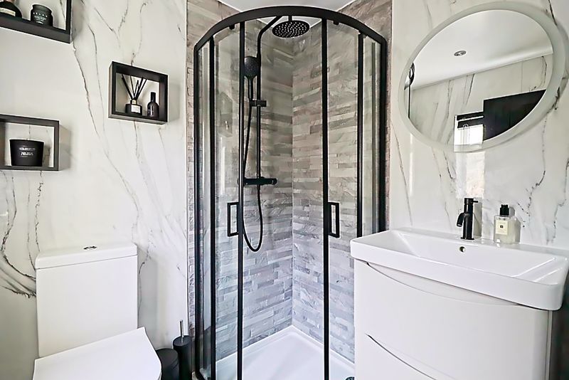 Double glazed obscure window to rear aspect, panelled bath, double shower cubicle, raised shower system, low level W/C, hand basin, heated towel rail, part tiled walls, smooth ceiling incorporating inset down lights, tiled flooring.