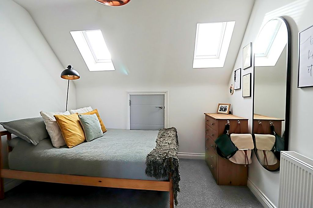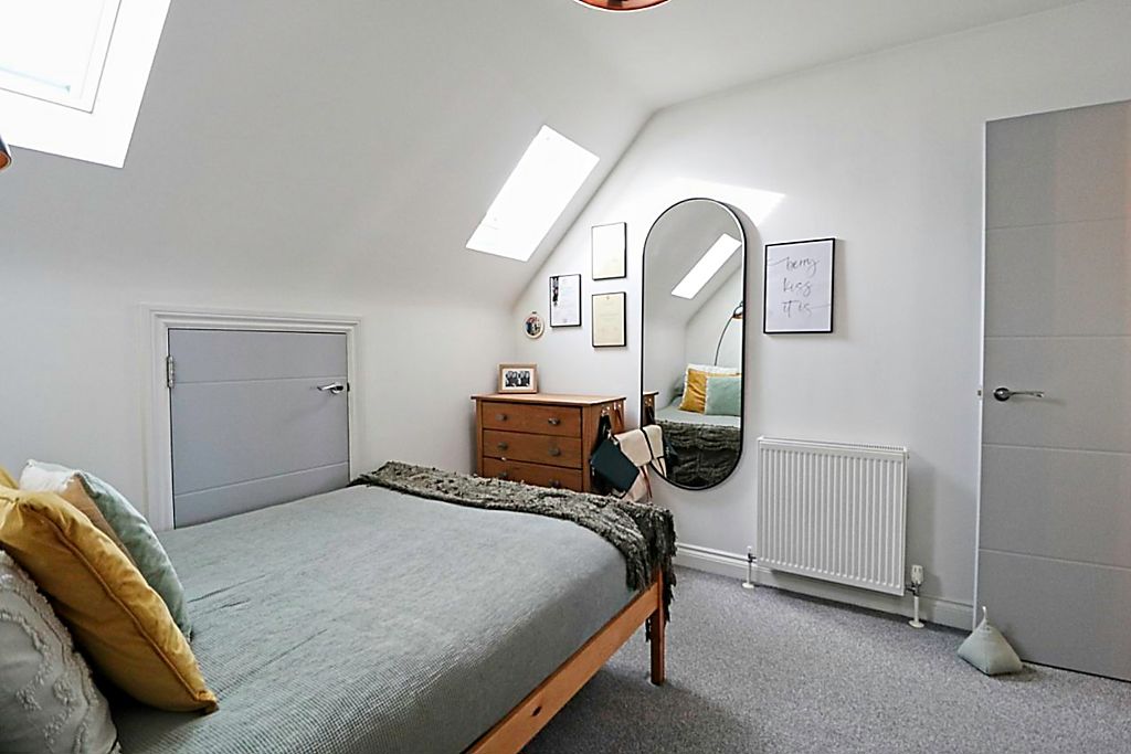 Two Velux windows to side aspect, storage cupboard, smooth ceiling, carpet flooring.
