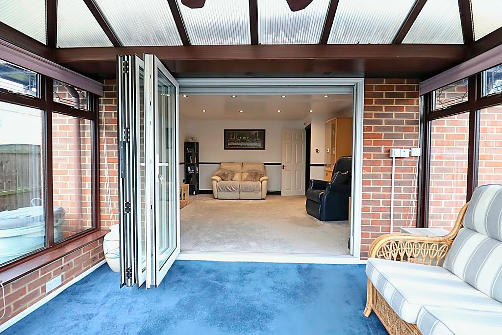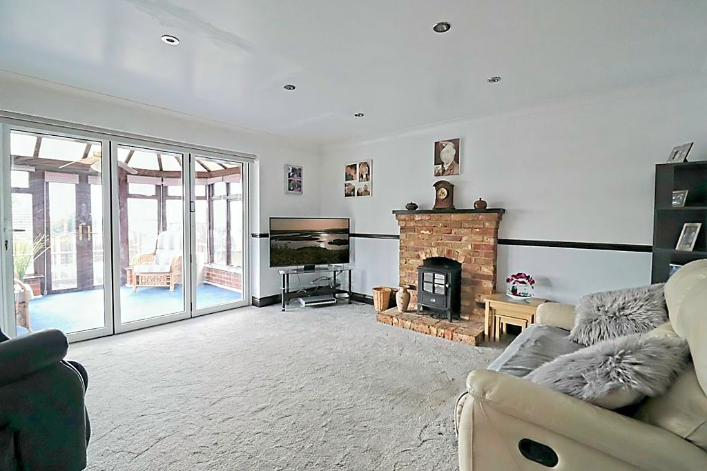 Double glazed folding doors to conservatory, feature fireplace, radiator, coving to smooth ceiling incorporating down lights, carpet flooring.