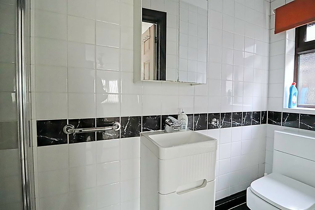 Obscure double glazed window to side aspect, radiator, low level WC, vanity hand basin, paneled bath, shower cubicle, smooth ceiling incorporating downlights, tiled walls & flooring.