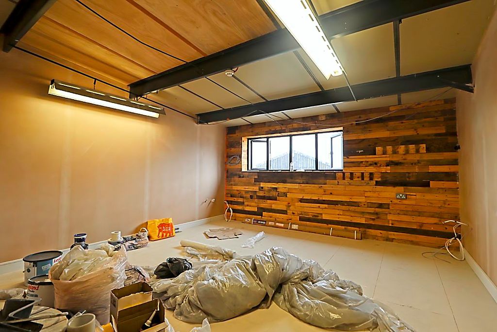 Full height ceiling with exposed beams, sky lights letting in natural light, industrial style iron frame windows, Bistro with seating area, doors leading to W/C’s, meeting & training rooms, multiple community facilities, kitchen areas, Hot desk area with all IT points (under development), Stairs leading to first floor.
