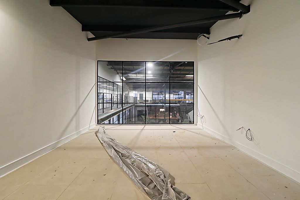 Full height ceiling with exposed beams, sky lights letting in natural light, industrial style iron frame windows, Bistro with seating area, doors leading to W/C’s, meeting & training rooms, multiple community facilities, kitchen areas, Hot desk area with all IT points (under development), Stairs leading to first floor.