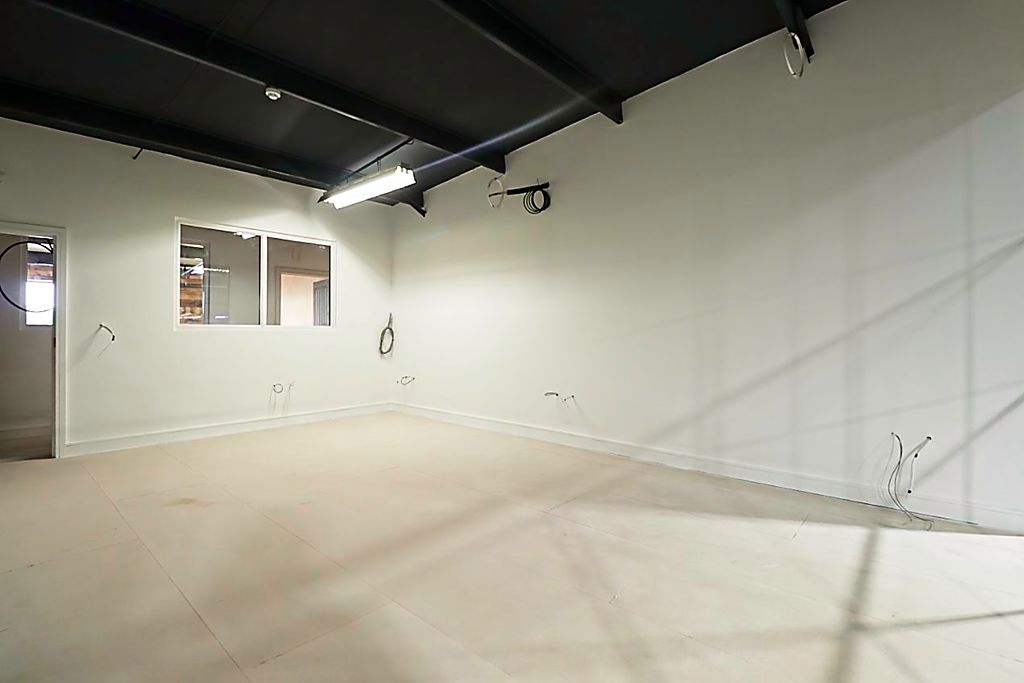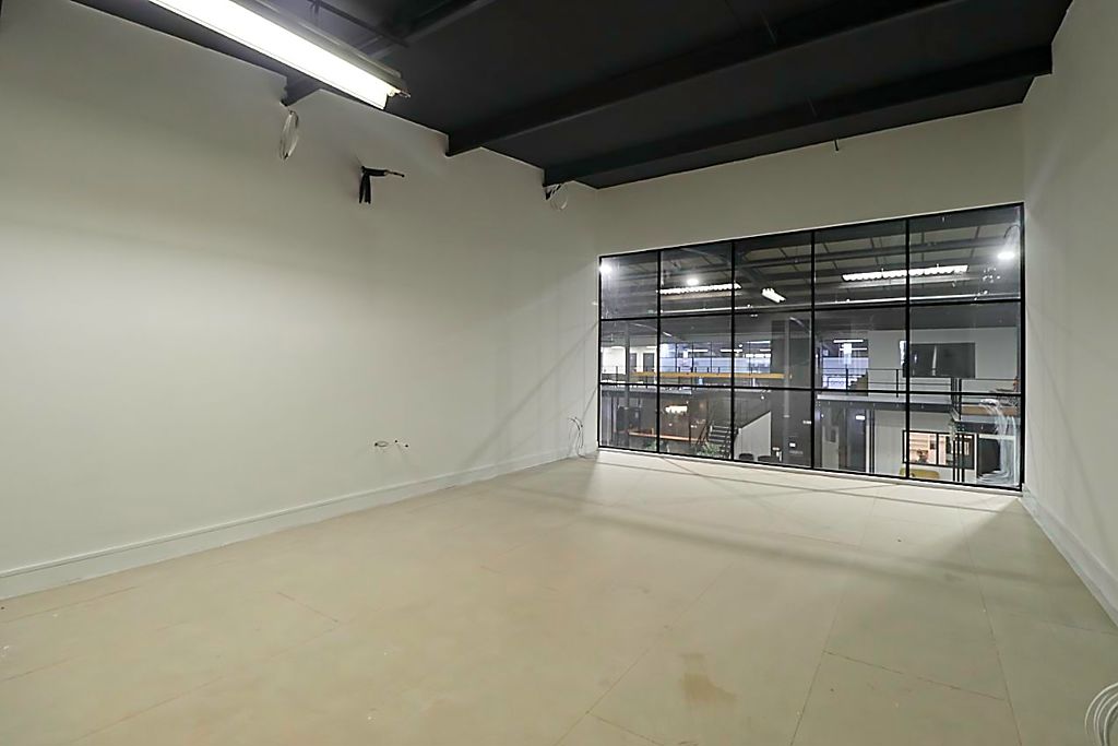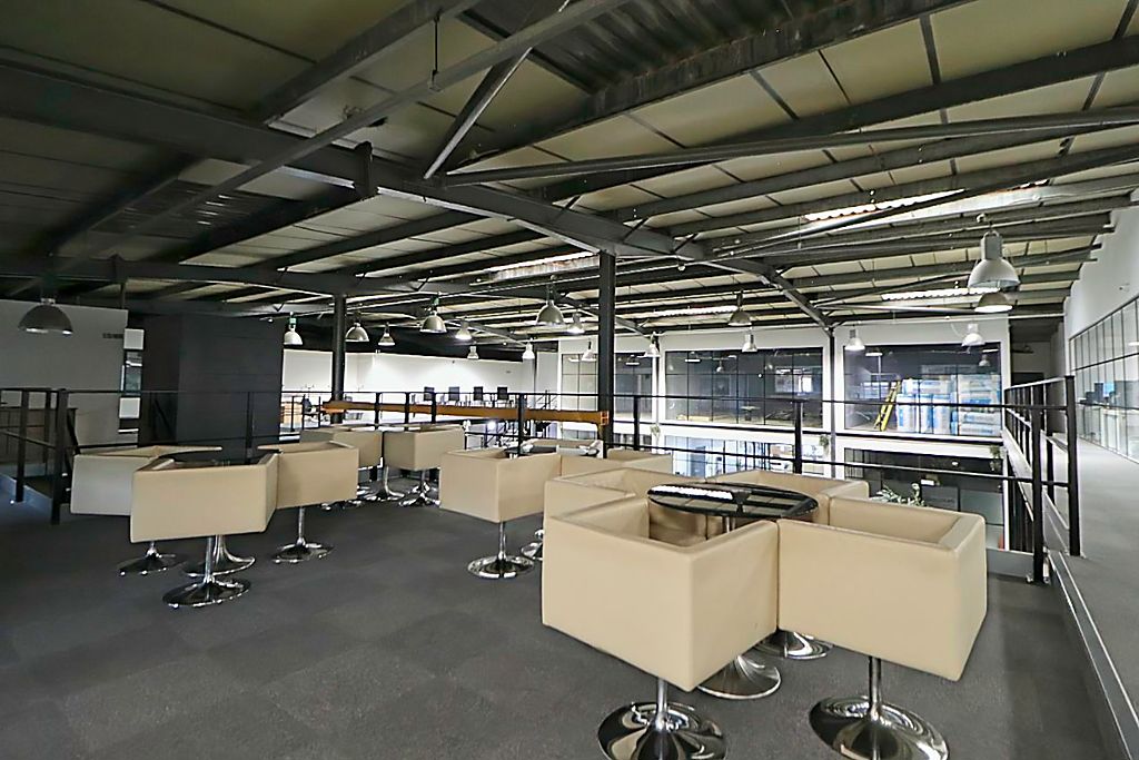 Full height ceiling with exposed beams, sky lights letting in natural light, industrial style iron frame windows, Bistro with seating area, doors leading to W/C’s, meeting & training rooms, multiple community facilities, kitchen areas, Hot desk area with all IT points (under development), Stairs leading to first floor.