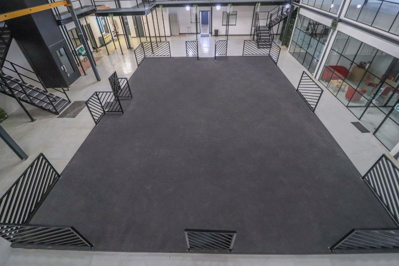 Full height ceiling with exposed beams, sky lights letting in natural light, industrial style iron frame windows, Cafe with seating area, doors leading to W/C’s, meeting & training rooms, multiple community facilities, kitchen areas, Hot desk area with all IT points (under development), Stairs leading to first floor.