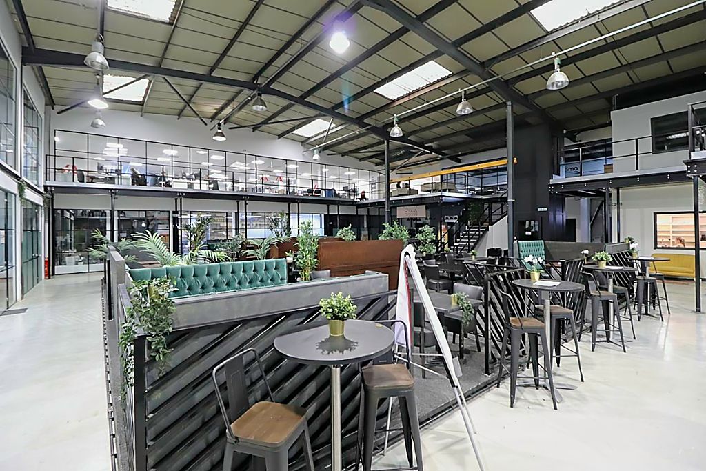 Full height ceiling with exposed beams, sky lights letting in natural light, industrial style iron frame windows, Cafe with seating area, doors leading to W/C’s, meeting & training rooms, multiple community facilities, kitchen areas, Hot desk area with all IT points.