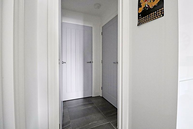 Cupboard housing bolier, tiled flooring with underfloor heating, smooth ceiling with down lights, doors to: