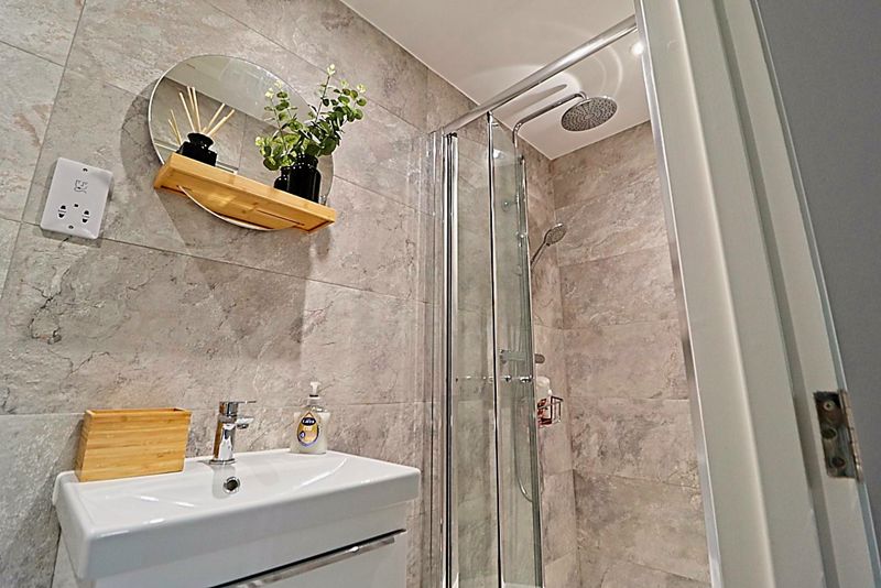 Shower cubicle with rainforst head, wash hand basin, low level WC, tiled walls and floor with underfloor heating, smooth ceiling with down lights.