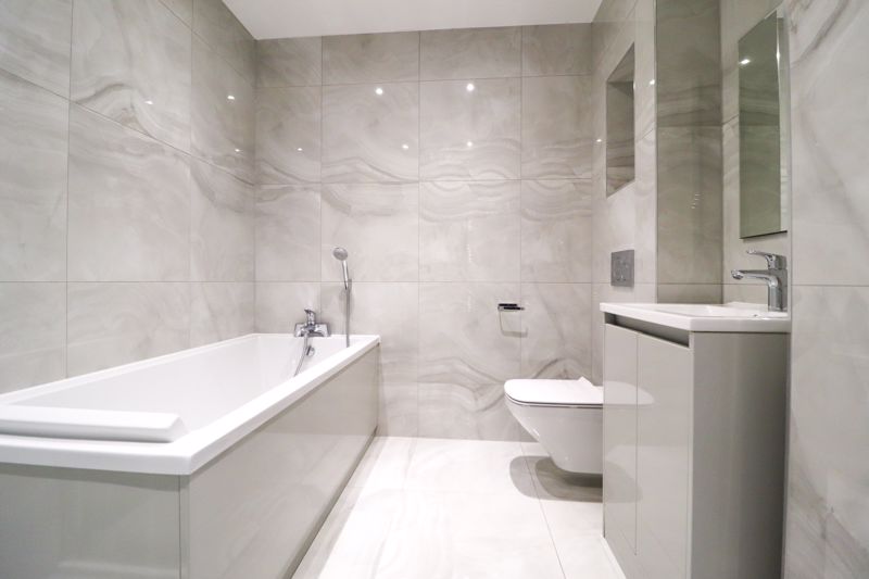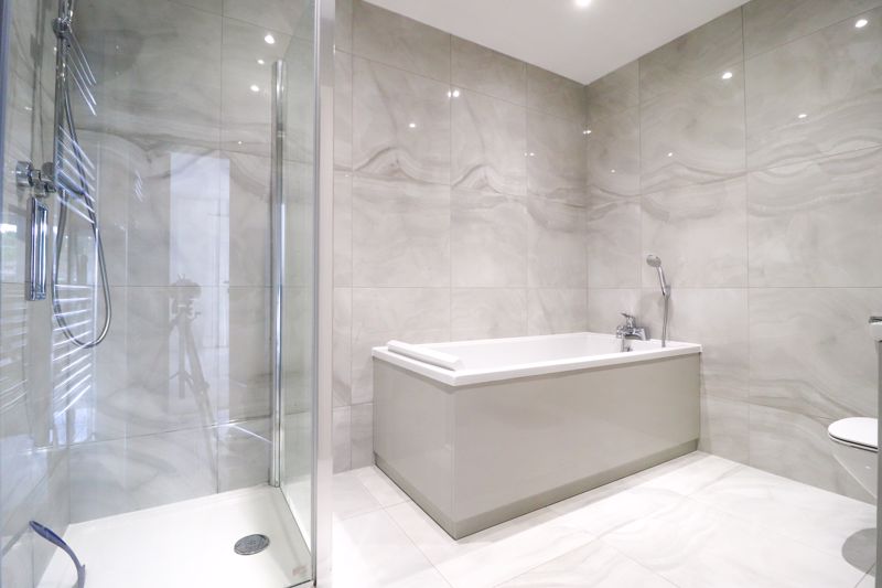 Wash hand basin, heated towel rail, paneled bath, double shower cubicle incorporating raised shower system, low level W/C, tiled walls, smooth ceiling incorporating inset down lights, tiled flooring incorporating under floor heating.