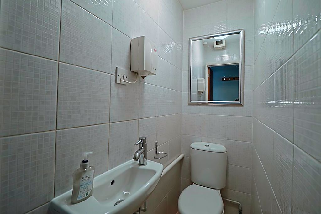 Hand basin, low level WC, tiling to walls, wood effect laminate flooring.