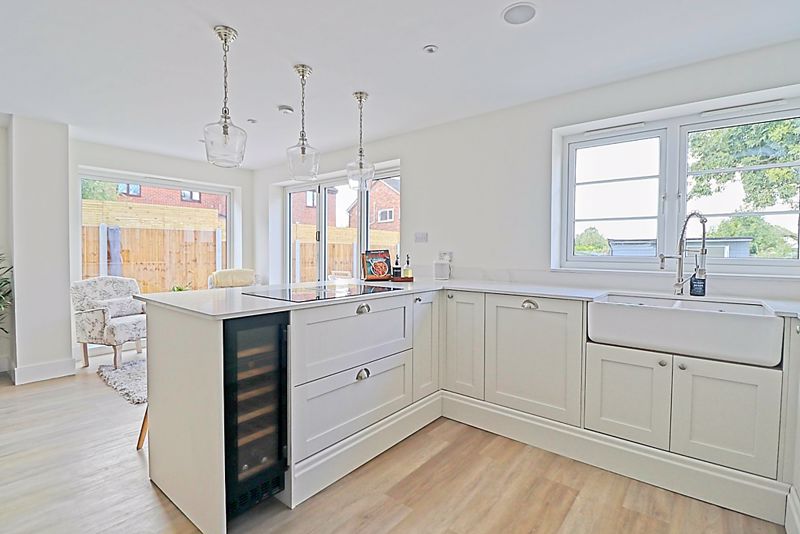 Range of fitted base and wall mounted units, quartz square edge work surfaces incorporating Butler sink, space and plumbing for appliances, boiler, Amtico flooring with underfloor heating, smooth ceiling incorporating downlights.