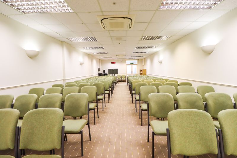 Stage to rear, wall lights, suspended ceiling with lighting, air conditioning / heating system, projector system, fire door to side access.