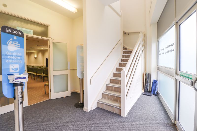 Double glazed windows to front aspect, stairs leading to first floor accommodation, cupboard housing electrical system and meters, carpeted flooring, door leading to Disabled Toilet, double doors leading to Main Ground Floor Reception.