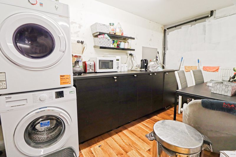 Two glazed windows to front aspect, storage cupboard housing fuse board, radiator, strip lighting, carpet flooring, door leading to W/C, kitchenette, stairs leading to: