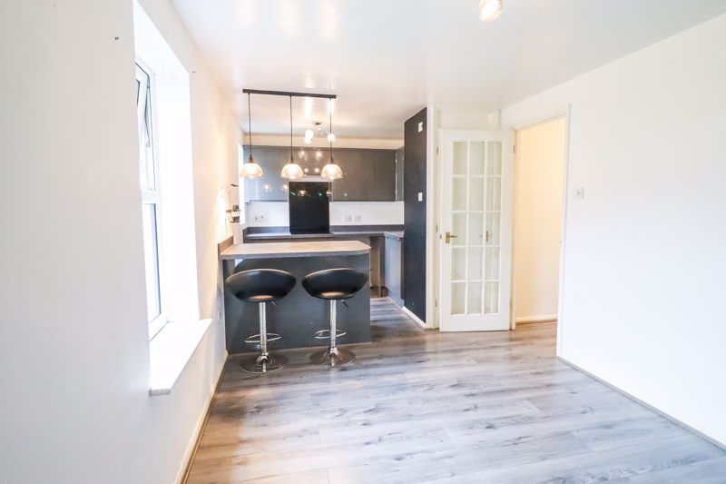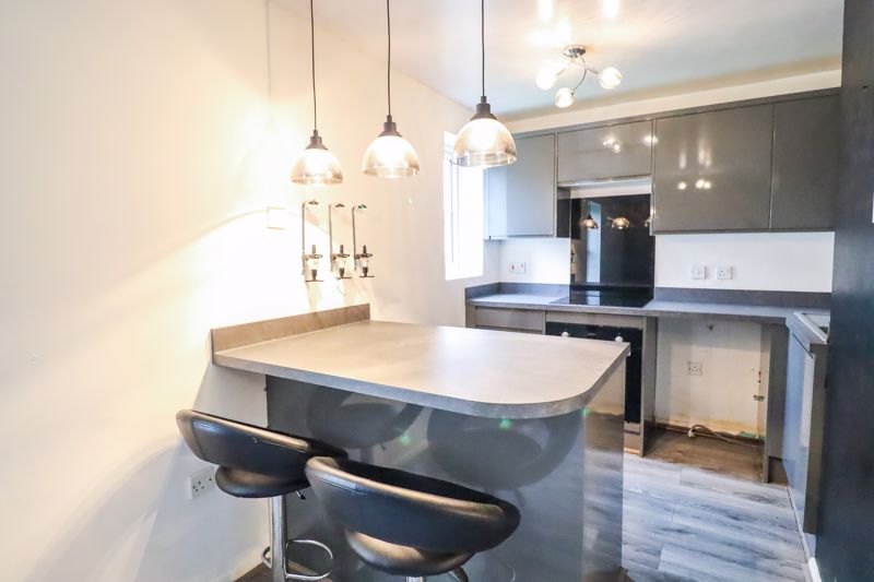 Double glazed window to side aspect, fitted with a range of base & wall mounted units, roll top work surfaces incorporating stainless steel sink & drainer, induction hob and integrated oven, space & plumbing for appliances, smooth ceiling incorporating downlights over fitted breakfast bar, wood effect flooring.