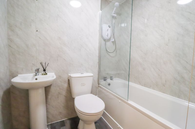 Panelled bath, raised shower system, shower screen, extractor fan, wash hand basin, low level W/C, smooth ceiling, wood effect flooring.