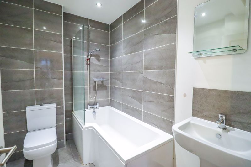 Panelled bath with raised shower system, shower screen, wash hand basin, low level W/C, tiled walls & flooring, smooth ceiling incorporating inset downlights.