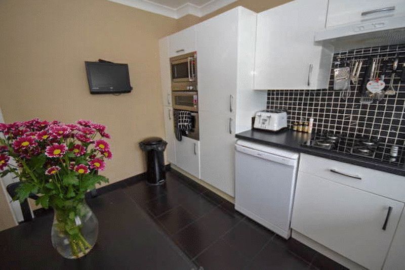 Double glazed window to front aspect, fitted with a range of base and wall mounted units, roll top work surfaces incorporating one and half bowl inset sink and drainer, four point gas hob with extractor over, fitted oven, space and plumbing for appliances, coving to smooth ceiling, splash back tiling, tiled flooring.