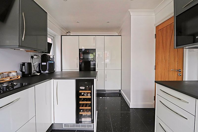 Double glazed window to front aspect, obscure double glazed panelled door to side aspect, range of fitted wall and base units, roll top work surfaces incorporating 2 1/2 sink and drainer, 5 point gas hob with extractor over, fitted double oven, microwave, integrated fridge/freezer, wine cooler, coving to ceiling incorporating downlights, tiled flooring.