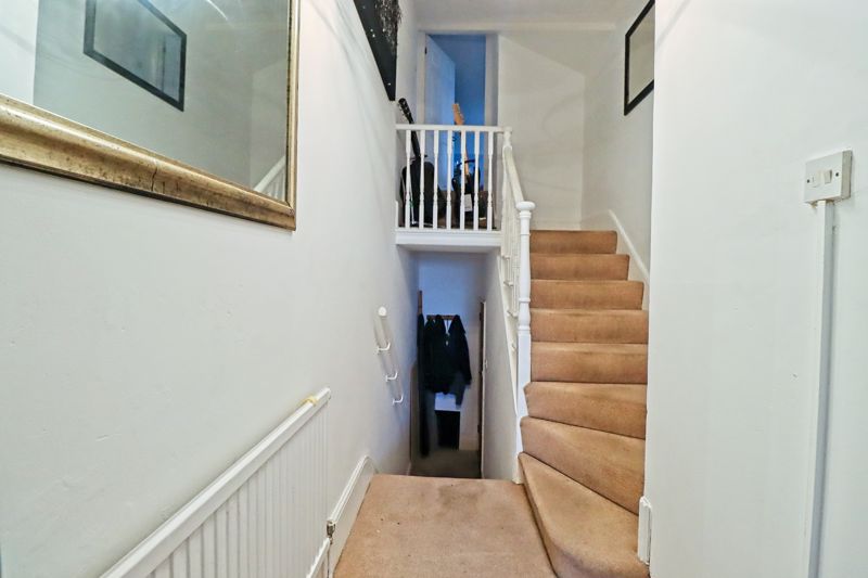 Stairs, radiator, smooth ceiling, carpet flooring, door to bedroom and bathroom, stairs to upper landing.