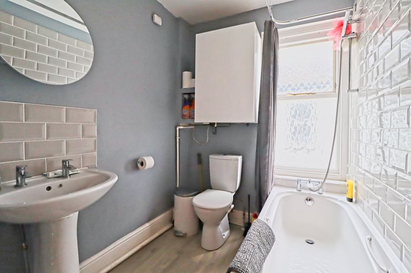 Obscure glazed window to side aspect, panelled bath with raised shower system, low level WC, stainless steel towel rail, cupboard housing combi boiler, smooth ceiling, wood effect flooring.