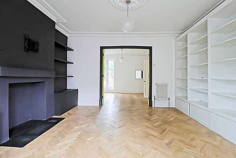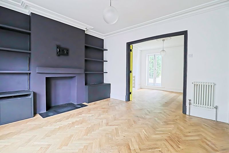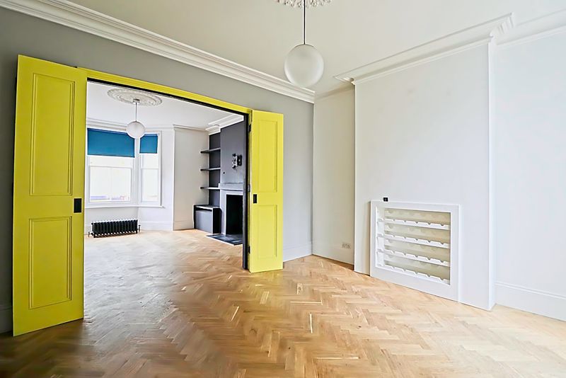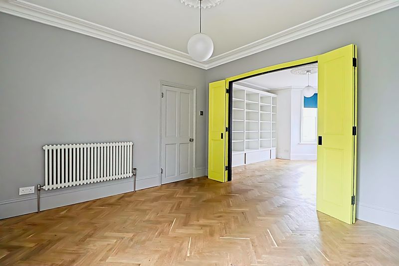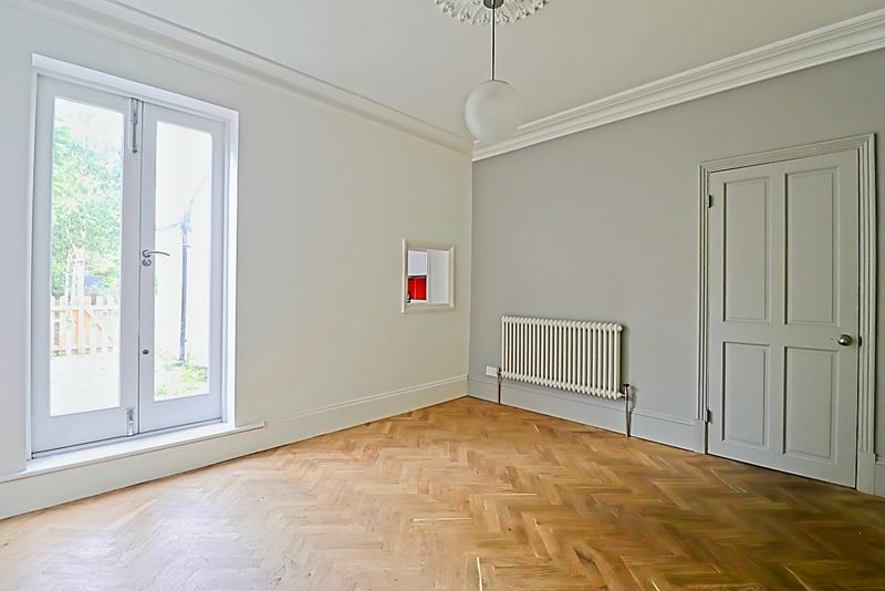 Double glazed French doors to garden, column radiator, coving to smooth ceiling, parquet flooring.