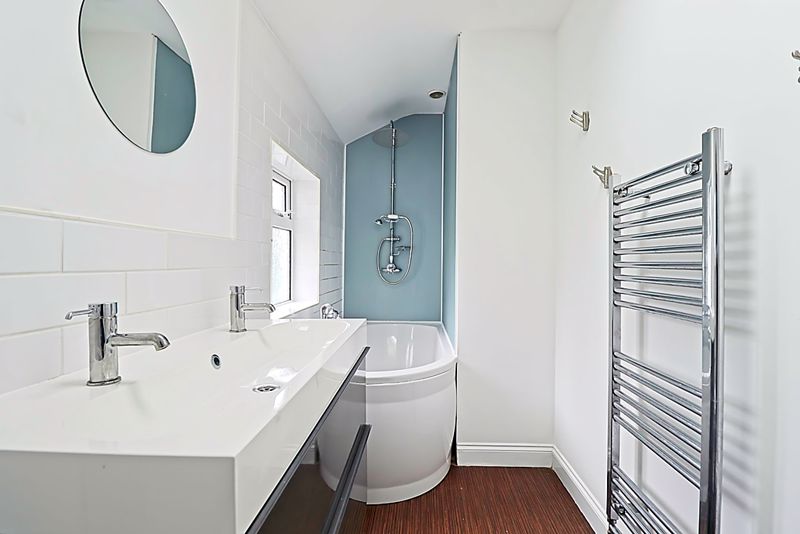 Double glazed obscure window to side aspect, corner bath with raised shower system over, hand basin, low level W/C, heated towel rail, smooth ceiling, laminate flooring.