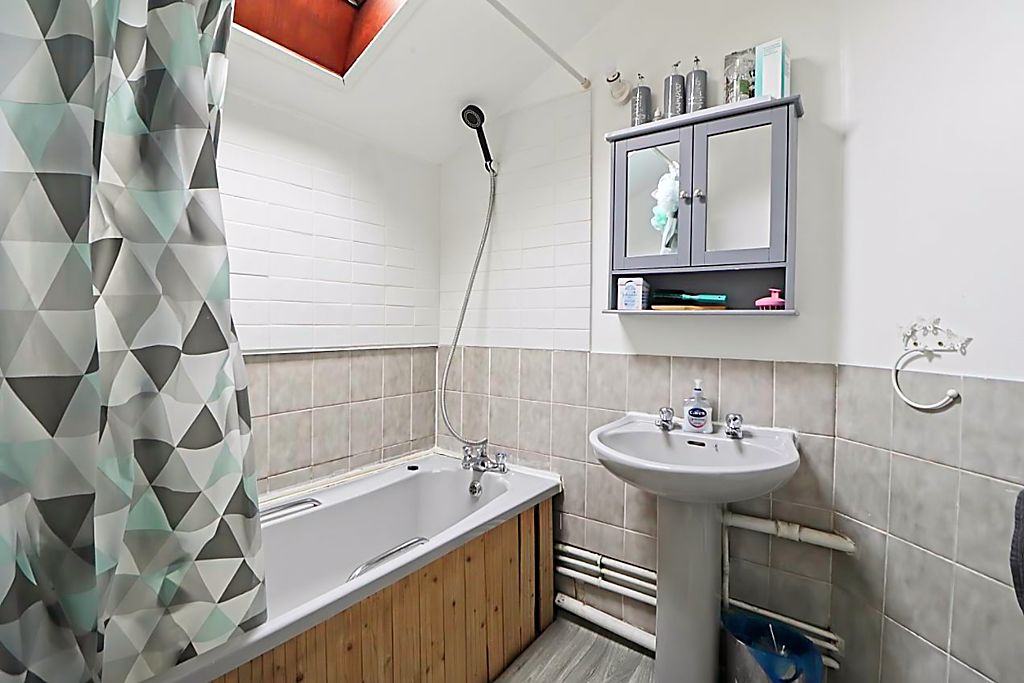 Double glazed velux window, panelled bath, pedestal hand basin, complimentary tiles.