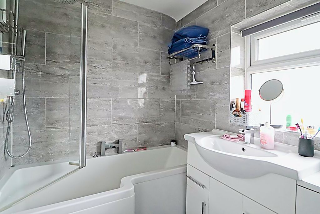 Obscure double glazed window to front aspect, paneled bath with shower screen, vanity hand basin, concealed cistern WC, complimentary tiling to walls, stainless steel towel rail, vinyl flooring, smooth ceiling.