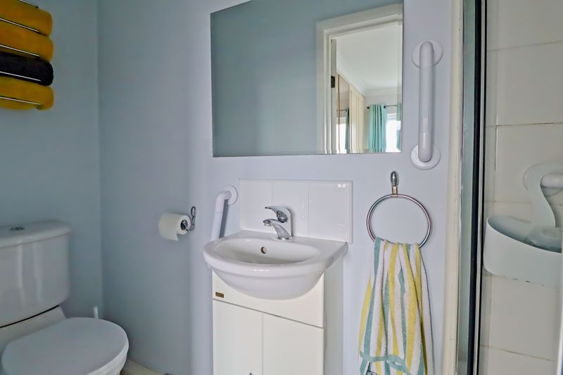 Shower cubicle with wall mounted shower, vanity hand basin, low level WC, coving to ceiling, tiled flooring.