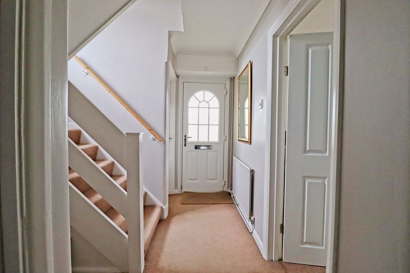 Stairs to first floor accommodation, understairs storage area, radiator, coving to ceiling, carpet flooring, doors to: