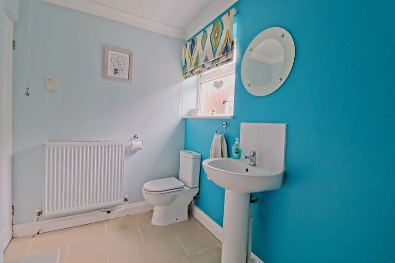 Obscure double glazed window to side aspect, hand basin, low level WC, tiled flooring.