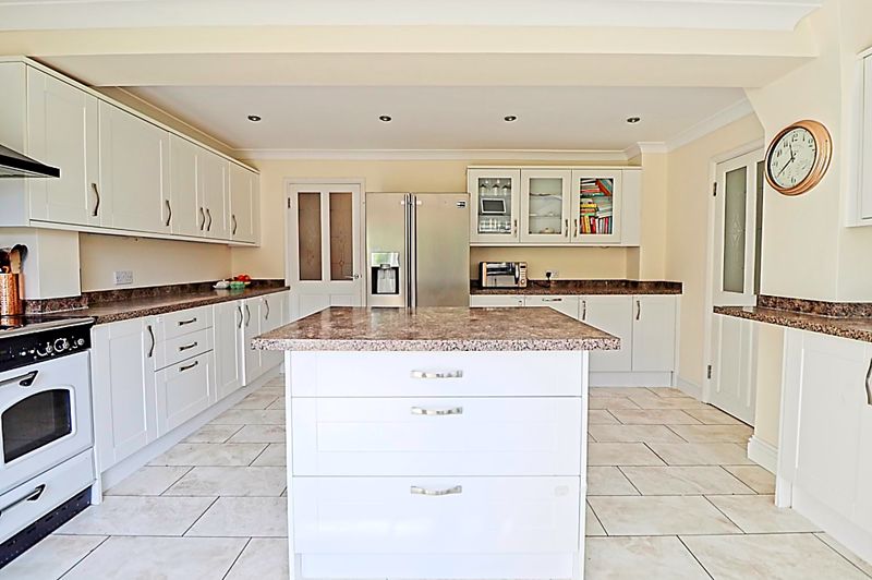 Double glazed window to rear aspect, double glazed French doors to rear garden, fitted with a range of wall and base level units, roll top work surfaces incorporating stainless steel sink and drainer unit, space and plumbing for appliances, center island, coving to smooth ceiling incorporating down lights, tiled flooring, door to: