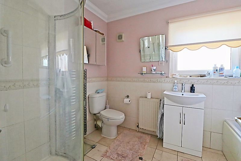 Obscure double glazed window to side aspect, panelled bath, vanity hand basin, low level WC, radiator, stainless steel towel rail, coving to ceiling, complimentary tiling to walls.