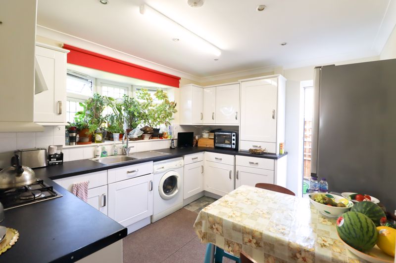 Double glazed bay window to side aspect, a range of base & wall mounted units, roll top work surfaces incorporating sink & drainer, four point gas hob, space & plumbing for appliances, smooth ceiling incorporating inset downlights, tiled flooring, double glazed paneled door to side aspect.