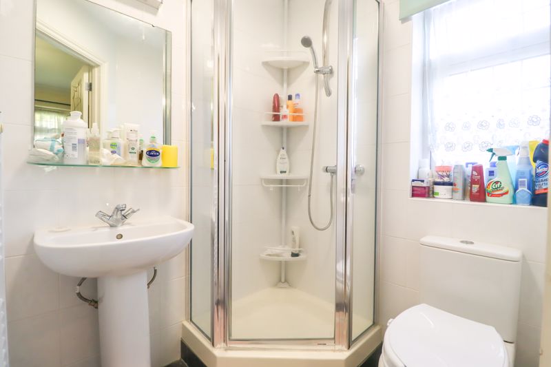 Obscure double glazed window to rear aspect, corner shower cubicle, raised shower system, wash hand basin, heated towel rail, low level W/C, smooth ceiling, tiled flooring.