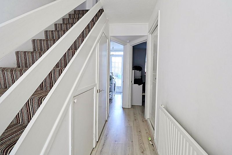 Stairs to first floor with understairs storage cupboard, radiator, smooth ceiling, wood effect flooring, doors leading to: