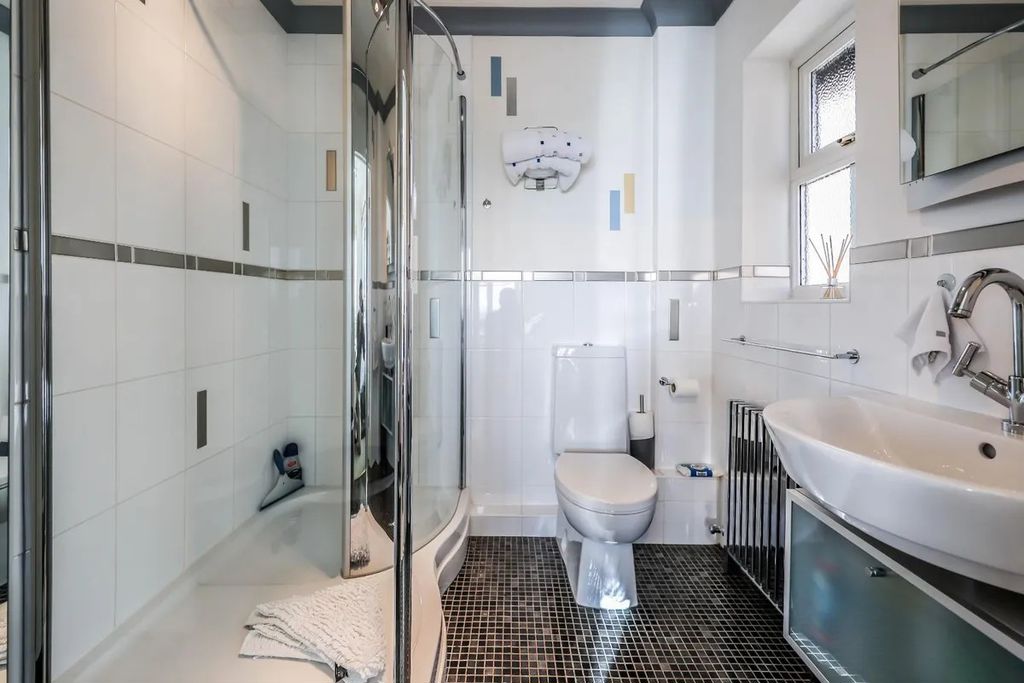 Obscure double glazed window to side aspect, shower cubicle, wall mounted hand basin, low level WC, radiator, coving to ceiling, tiling to walls, tiled flooring.