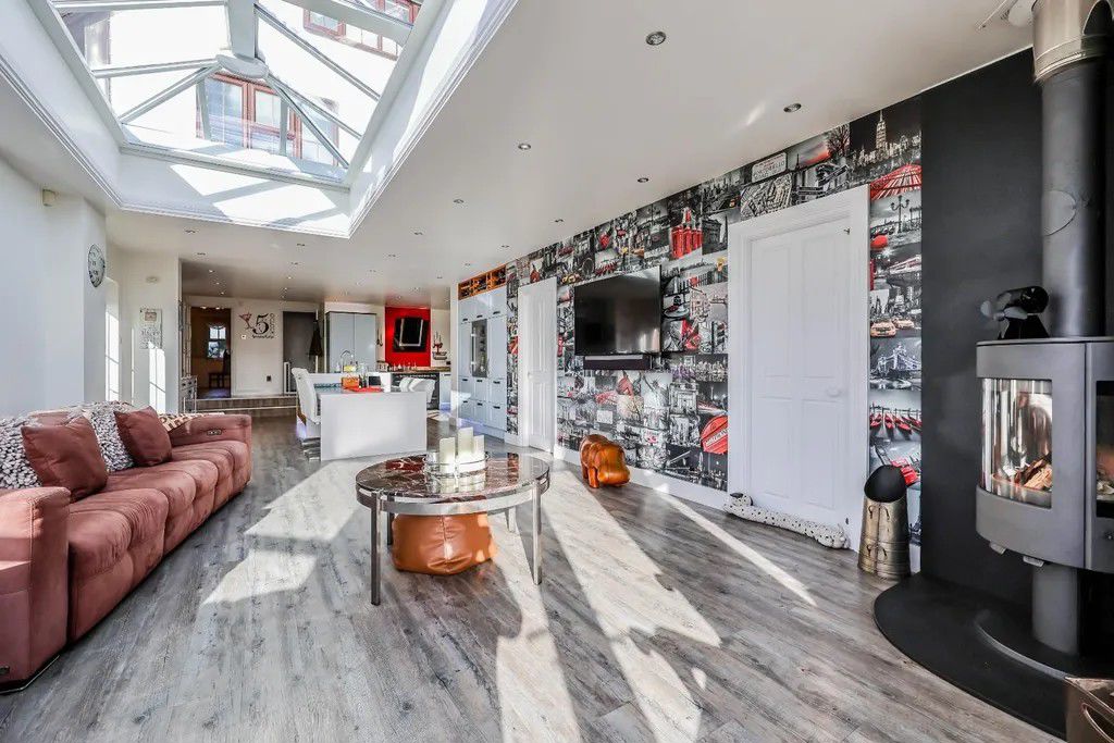 Kitchen : Double glazed window to side aspect, double glazed French doors to rear garden, fitted with a range of base and wall mounted units, Granite work surfaces, integrated oven, steam oven, microwave, warming drawer and coffee machine, range cooker with extractor over, integrated double fridge/freezer, integrated wine fridge, center island with Corian work surface incorporating sink unit with Quooker tap, integrated Siemens dishwasher, bespoke fitted table, smooth ceiling incorporating down lights, Karndean wood flooring with underfloor heating, door to Utility Room, opening to: Orangery / Family Room : Double glazed windows to side and rear aspects, feature floor standing log burner, vaulted ceiling with inset downlights and incorporating roof lantern with electric blinds, Karndean wood flooring with underfloor heating, doors to: