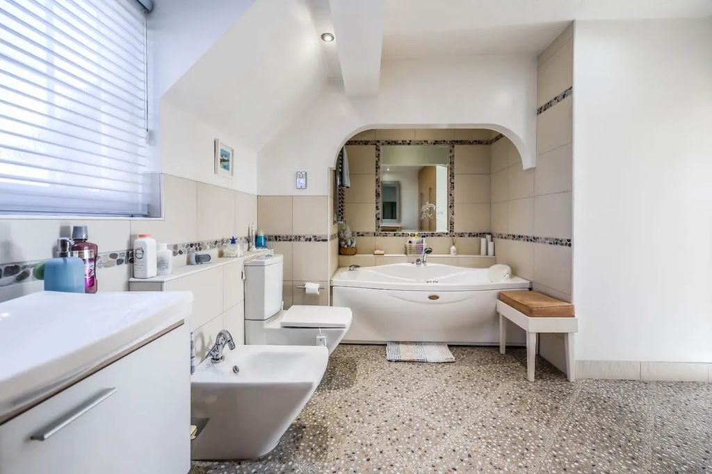 Obscure double glazed window to side aspect, panelled bath with hand held shower attachment, shower cubicle with rainfall shower head and hand held shower attachment, vanity hand basin, low level WC, bidet, heated towel rail, smooth ceiling incorporating down lights, tiled flooring.