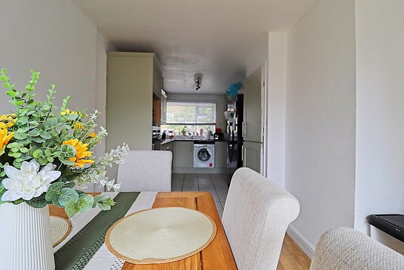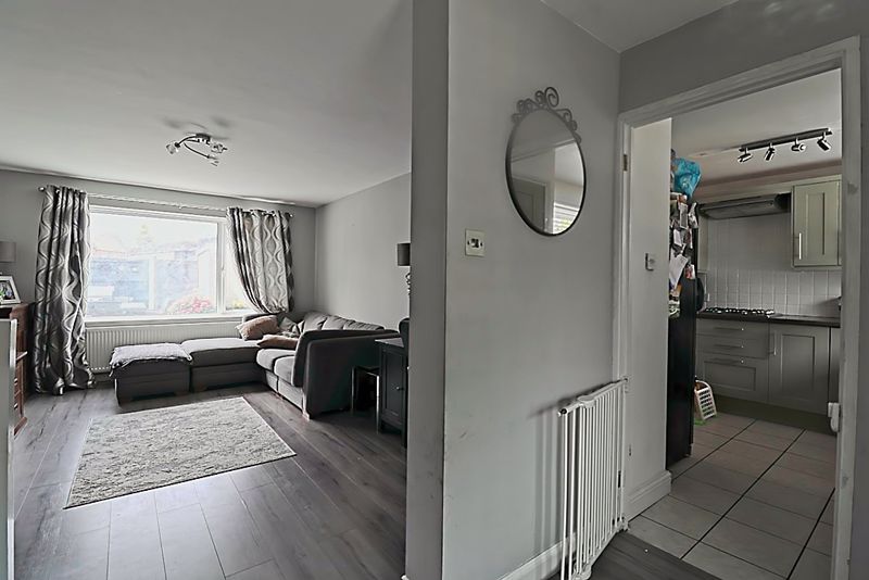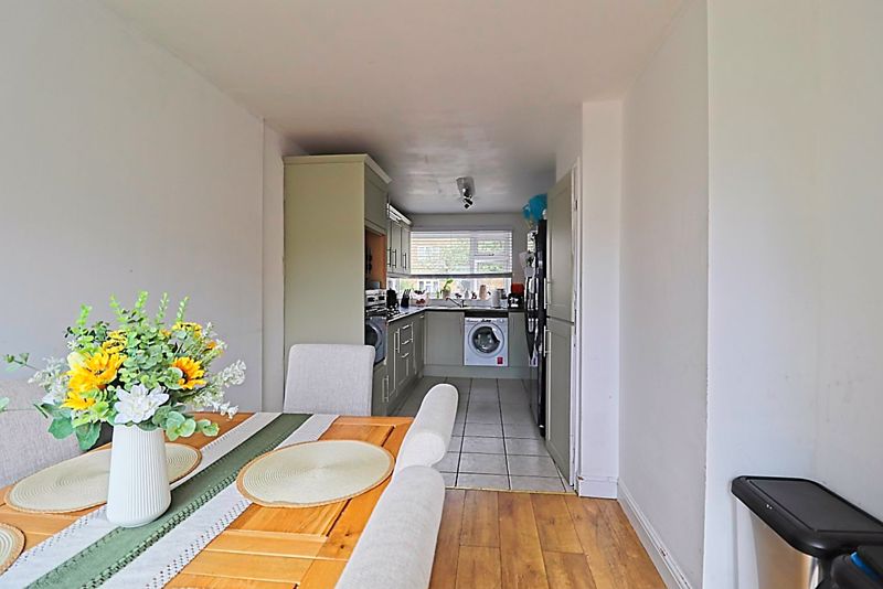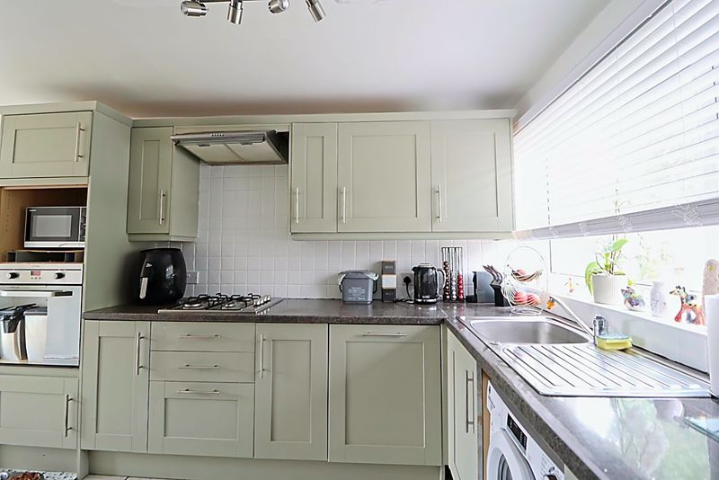 Double glazed window to front aspect, double glazed sliding door to rear aspect, range of fitted wall and base units with work surfaces incorporating four point gas hob with extractor over, sink and drainer unit, fitted electric oven, integrated dishwasher & washing machine, space for appliances, built in storage cupboard incorporating combi boiler, radiator, smooth ceiling, tiled and wood effect flooring.