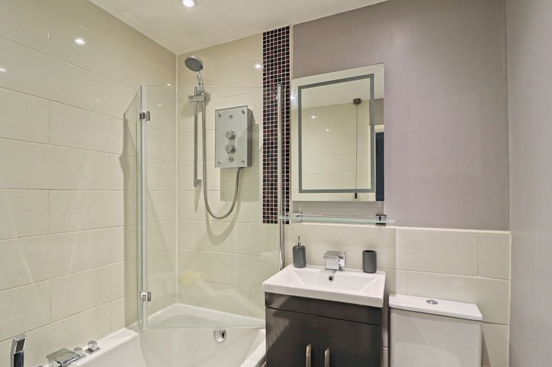 P-shaped panelled bath, vanity hand basin, low level wc, extractor, smooth ceiling including downlights, tiled flooring.