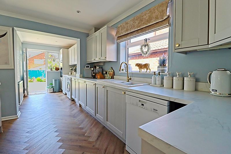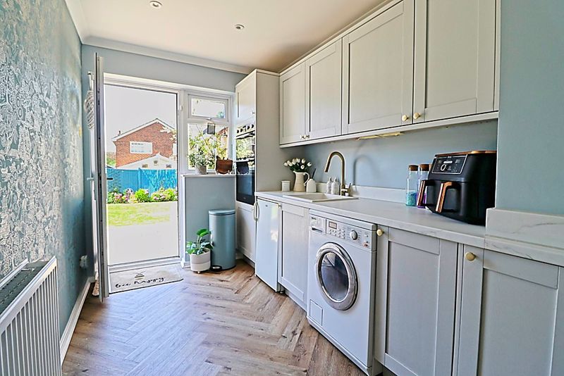 Double glazed window to rear aspect, double glazed panelled door to rear garden, fitted range of wall and base units, fitted double oven, space and plumbing for appliances, roll top work surfaces incorporating sink, radiator, luxury vinyl tiled flooring, coving to smooth ceiling incorporating down lights.