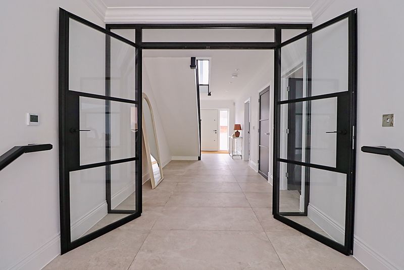 Vaulted reception hall, glass & black oak staircase with carpeted stairs, tiled flooring with underfloor heating, smooth ceiling incorporating down lights, black aluminum industrial style double doors leading to rear family room, black oak doors leading to: