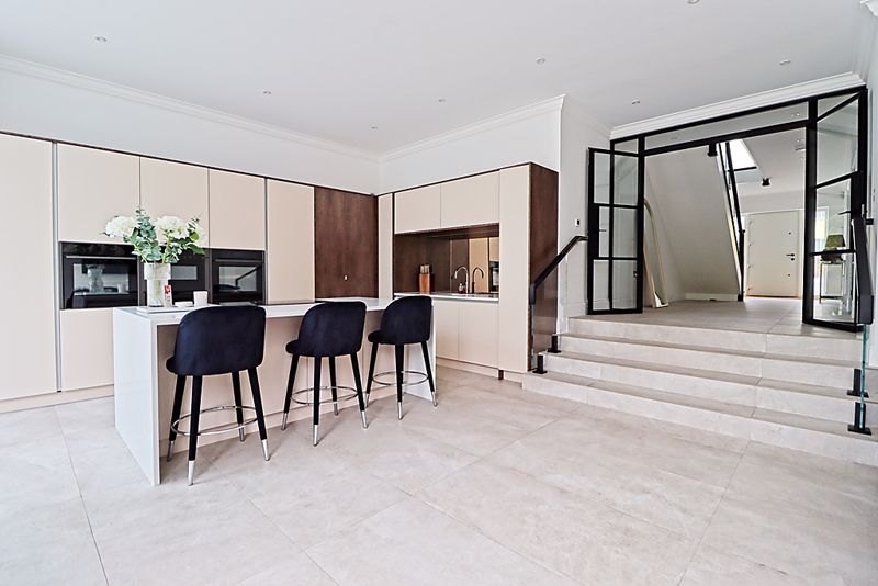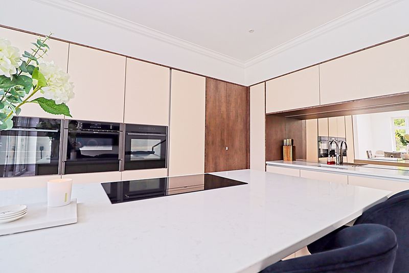 Fitted with a range of wall and base mounted units, granite work surfaces incorporating sink and drainer unit, two integrated ovens and combi microwave, integrated dishwasher, larder cupboard, mirrored splash backs, central island with granite work surface incorporating five point induction hob and raising extractor, tiled flooring with underfloor heating, coving to smooth ceiling incorporating down lights, opens to: