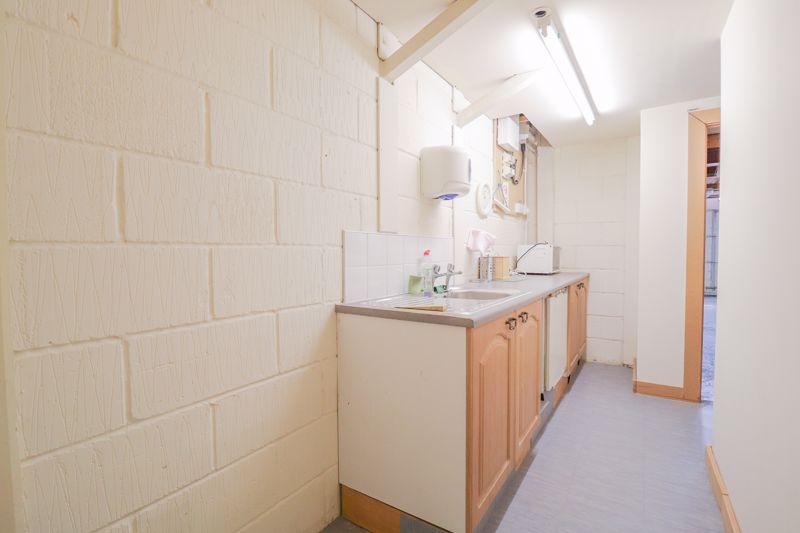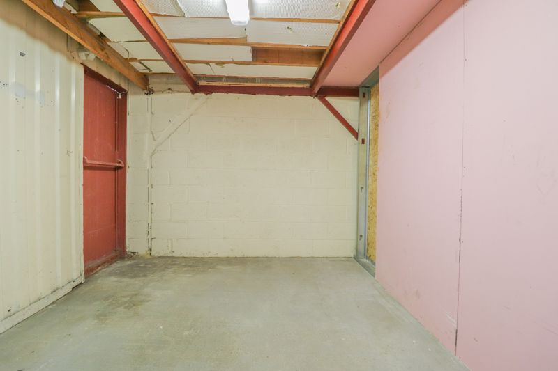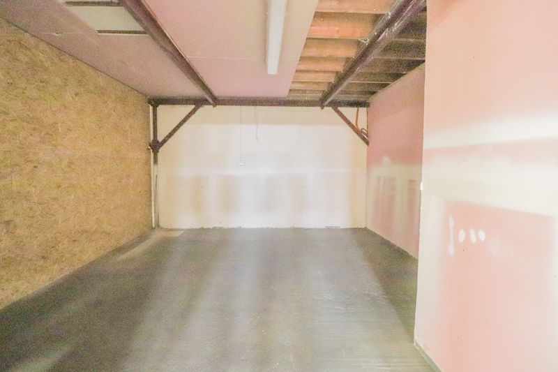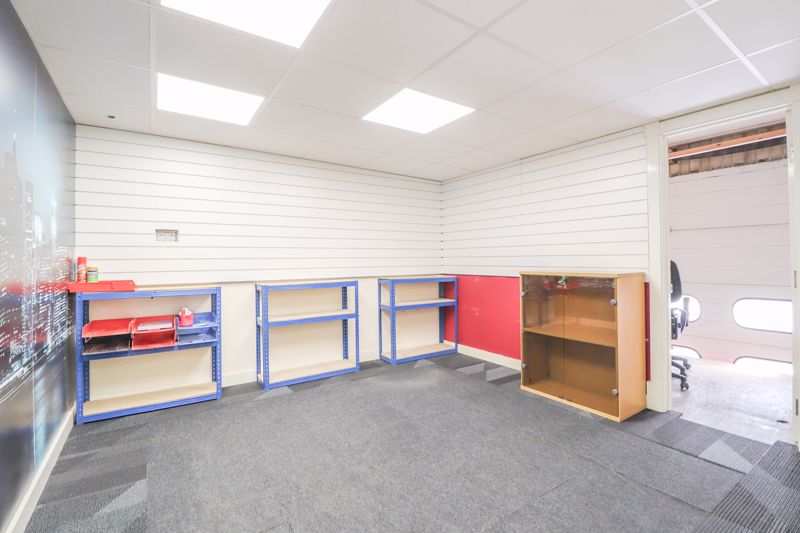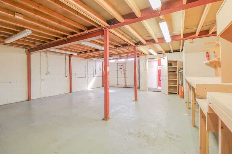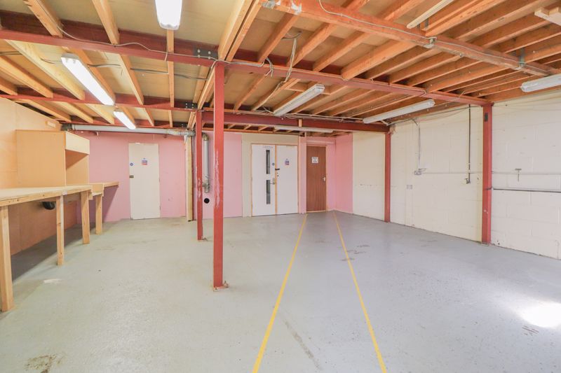 Double height roller door, work benches to side, power, lighting & water connected, concrete flooring, double doors leading to secure rear room, door leading to rear exit room, door leading to: