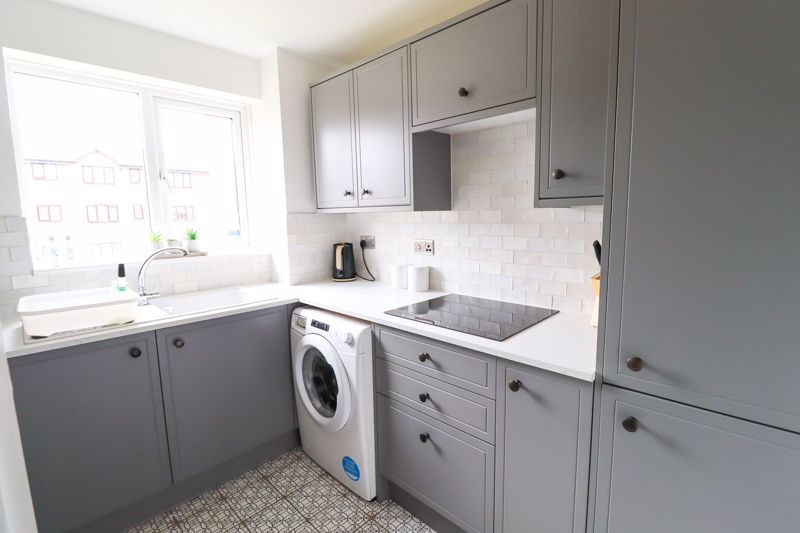 Double glazed window to rear aspect, fitted range of base & wall mounted units, roll top work surfaces incorporating sink & drainer unit, induction hob with extractor over, integrated oven, integrated fridge/freezer, splash back tiling to walls, tiling to floor, smooth ceiling.