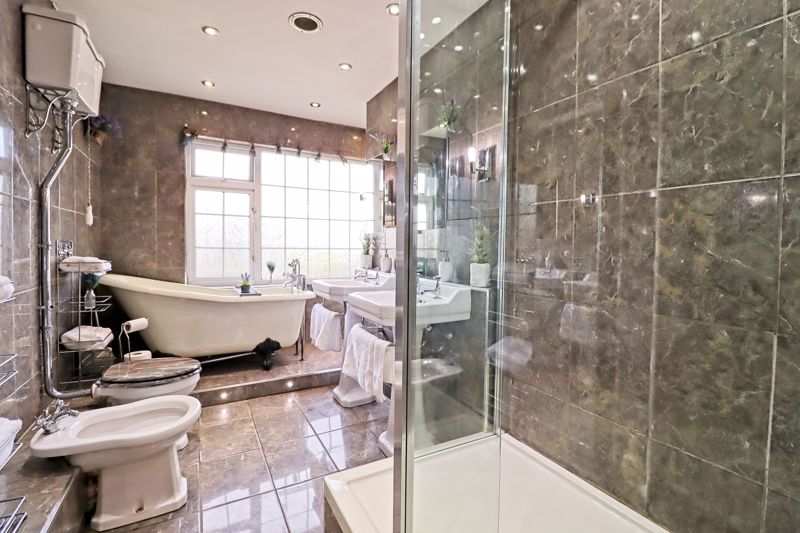 Obscure double glazed window to side aspect, roll top bath, double shower cubicle, 2 hand basins, low level WC, bidet, complimentary tiling, tiled flooring, smooth ceiling with downlights.